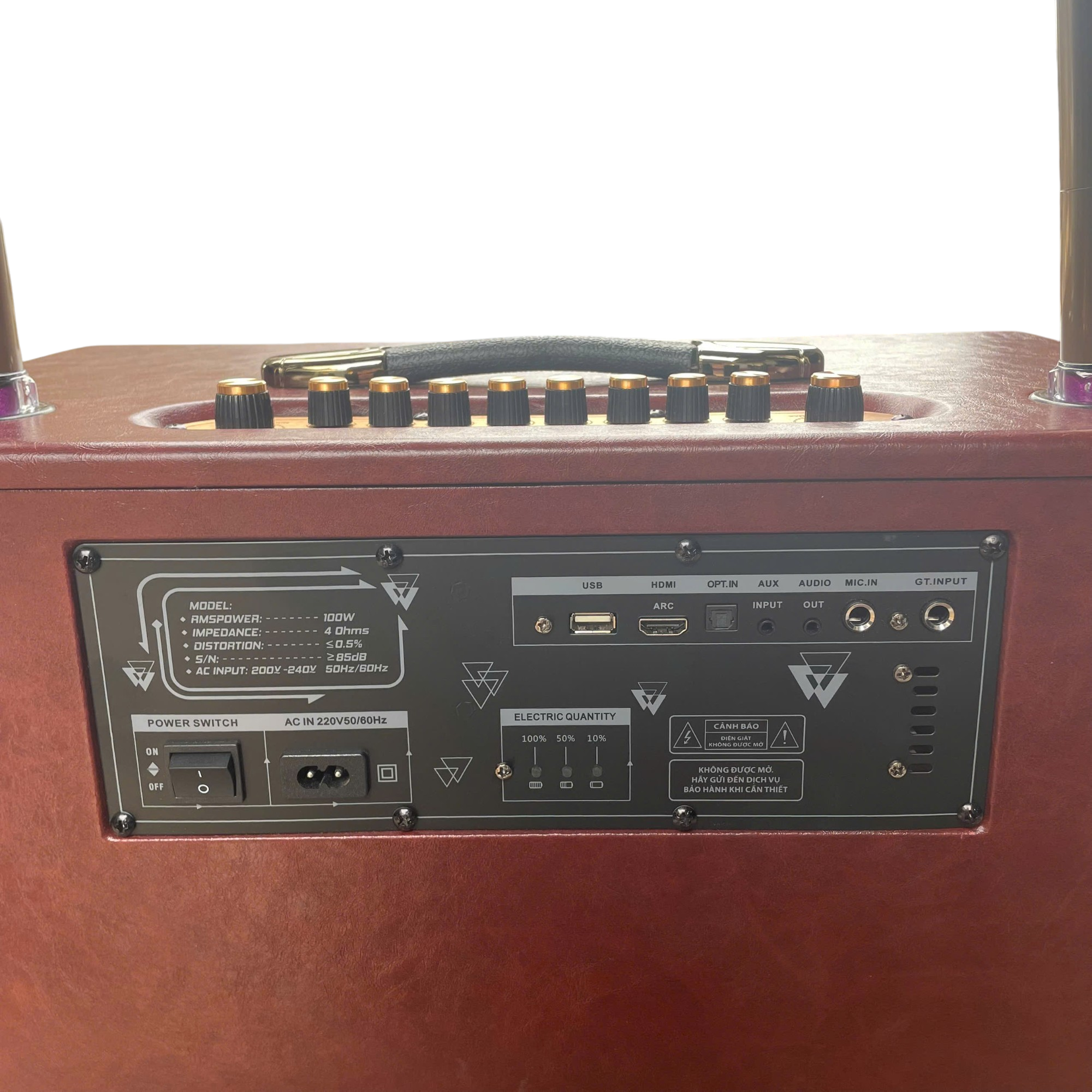 Loa được tích hợp mạch công suất K1000 PLUS (kích thước 8 x 45 cm), cho công suất thực 100W và đạt công suất PMPO 400W, đủ mạnh để phủ âm tốt trong không gian vừa và nhỏ như lớp học, phòng khách, buổi họp nhóm…
